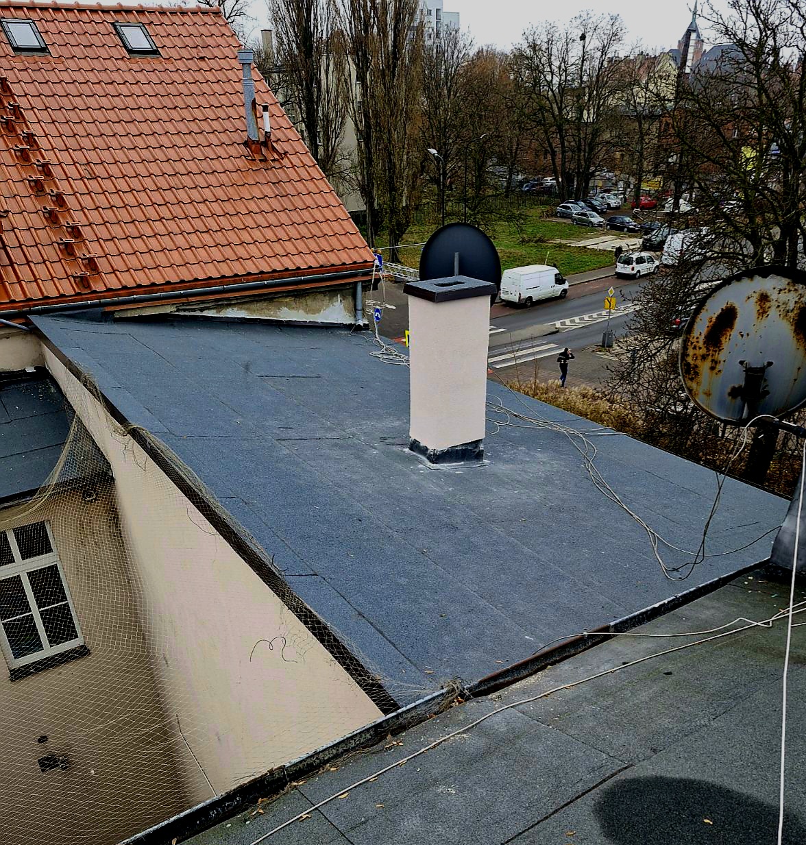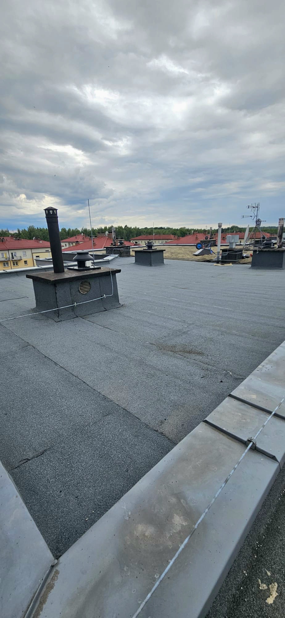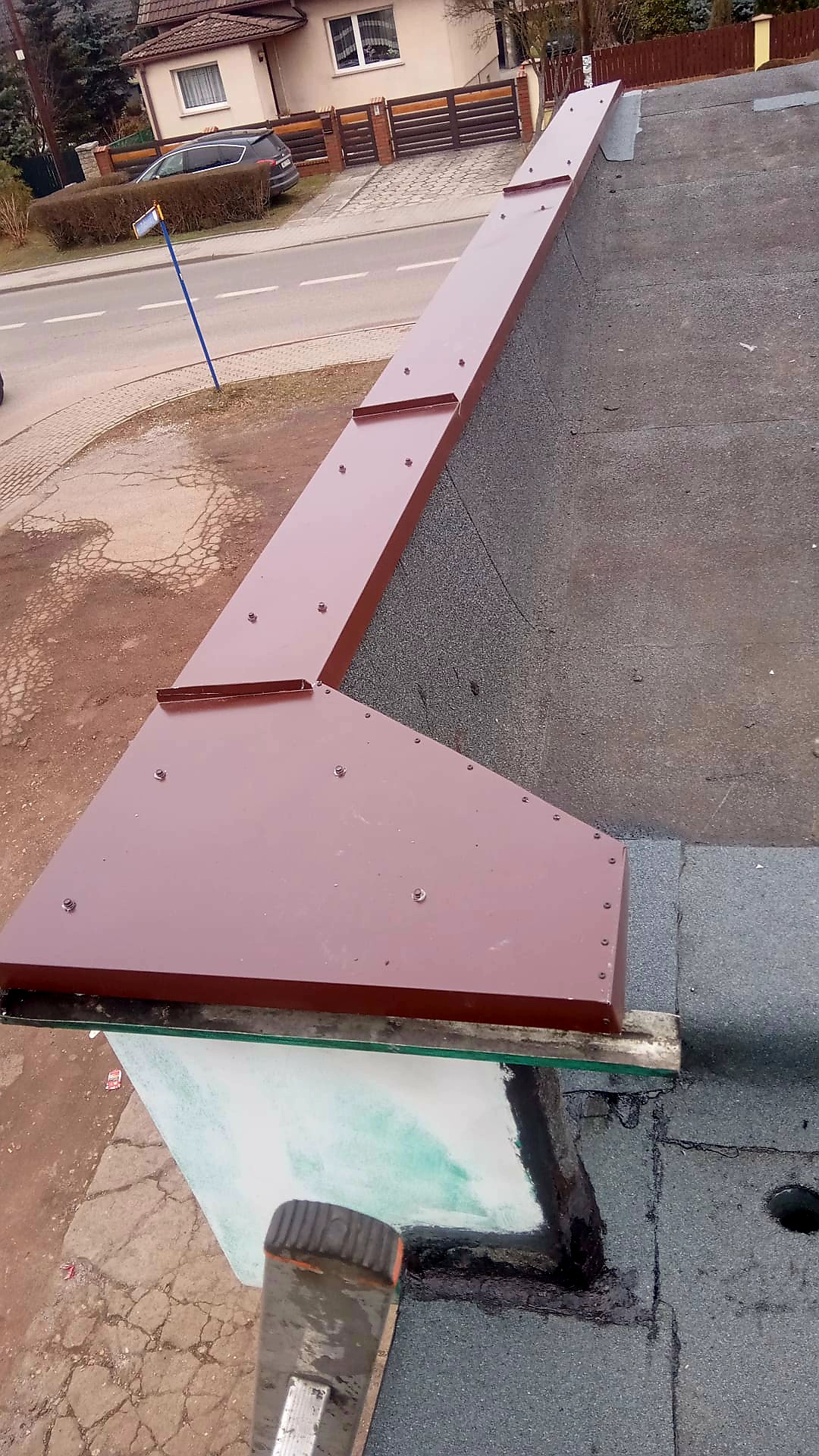 Wymiana pokrycia dachowego z obróbkami blacharskimi, wyklejanie kominów wywiewnych.