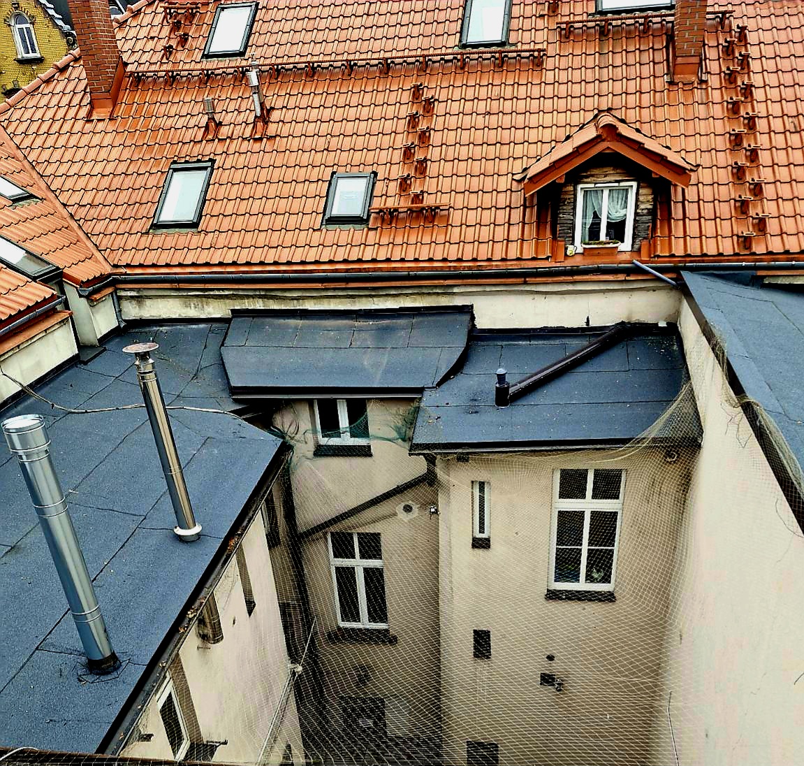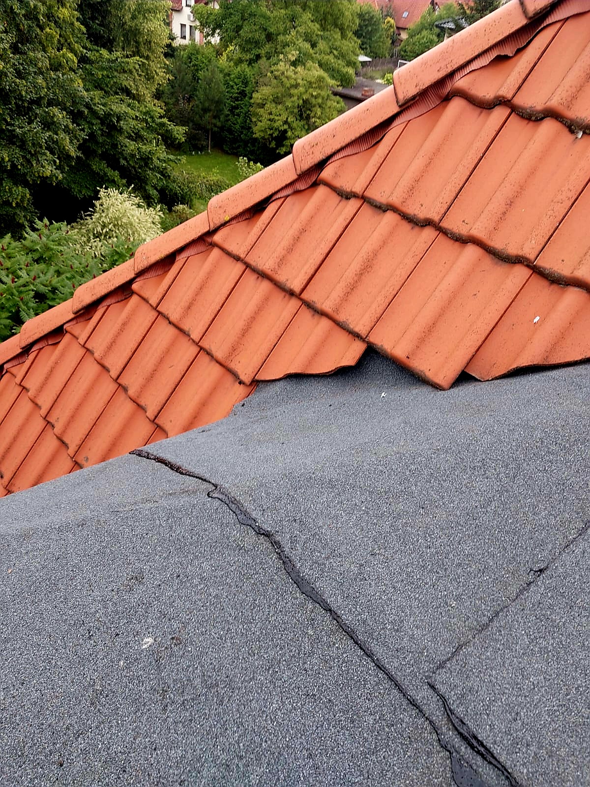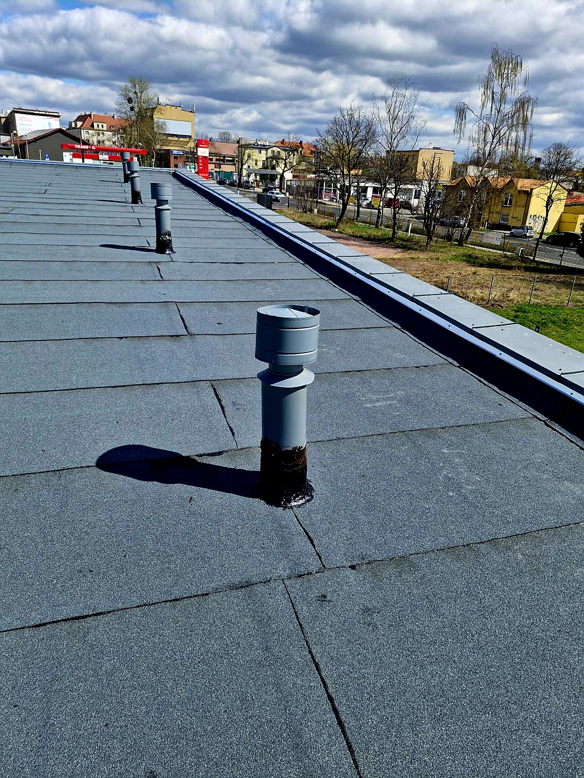 Wymiana pokrycia dachowego z obróbkami blacharskimi, wyklejanie kominów wywiewnych.